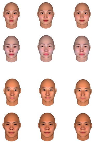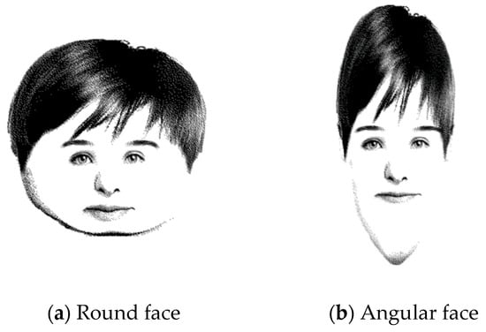 Following previous studies [,] (FaceGen Modeller 3.14), we created the round, angular, and neutral faces using a realistic 3D human face generator. Initially, we randomly generated four male and four female faces (Asian) for the neutral conditions. Using FaceGen Modeller, we changed the cheeks (round/gaunt) parameter for the round faces (the parameter = −0.5), neutral faces (the parameter = 0), and angular faces (the parameter = +0.5). FaceGen Modeller allows users to create round/angular facial stimuli with an almost identical arrangement of inner features (eyes, mouth, nose) and prevents possible confounding effects derived from facial parts, facial expressions, or skin color. We used 24 stimuli (four males and four females ranging from round-faced to neutral to angular-faced). Examples of stimuli used in Study 3 are shown in Figure 5.