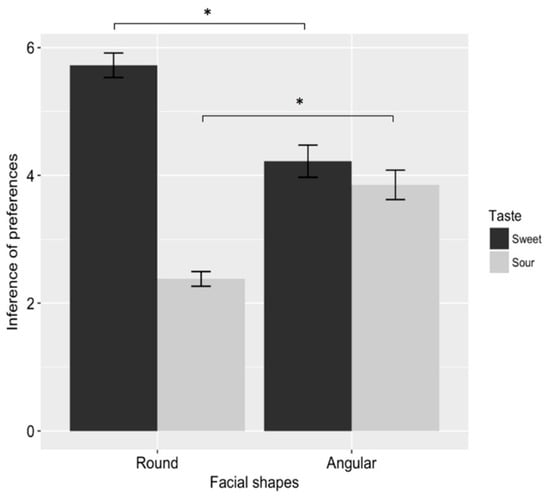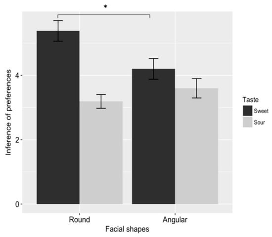 Results of Study 2. The round-faced (vs. angular-faced) person was perceived as more strongly preferring sweet (vs. sour) foods, while the angular-faced person was not to be perceived as liking sour (vs. sweet) foods. Error bars represent standard error. Asterisks denote significant difference (p < 0.05 *).
