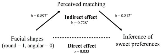 Model to predict the effect of facial shapes on inference of sweet preference mediated by perceived matching. Standardized coefficients (b) are displayed. Asterisks indicate significant paths (p < 0.05 *).
