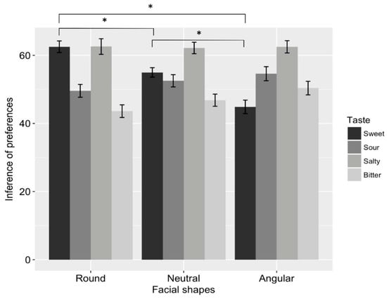The term “social perception” can be defined as the initial stage of evaluating the intentions and psychological dispositions of others []. Social perception can be conceptualized as part of mentalizing [], which is the perception of the dispositions and intentions of other individuals []. Thus, the domain of social perception is implicated when a study includes human features (e.g., faces) and/or social judgments (e.g., inference about a person’s preferences) [,,]. However, it remains unknown whether correspondences between facial shapes and other senses (e.g., taste) influence inferences about other peoples’ preferences. This study investigated the role of facial shape and taste correspondence on social perceptions in the form of inferences about other peoples’ preferences.