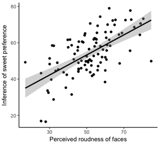Scatterplots show correlations between the perceived roundness of faces and inferences about preferences for sweet foods. The dots were derived from the mean value of each condition (round, angular, and neutral) for each participant. This graph is for illustration purposes only, as we did not control for potential confounding factors (t = 7.719, p < 0.001, r97 = 0.617).