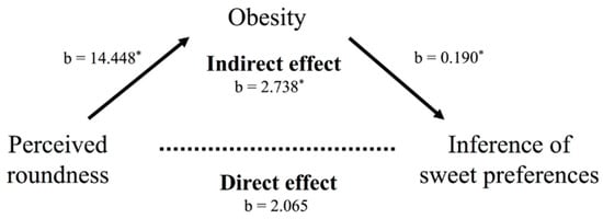 To examine whether obesity mediates the relationship between facial shape and inferences of sweet/sour preferences, we carried out a mediational analysis. We modeled the indirect effect of facial shape on inferences about round-faced people’s sweet preferences, as mediated by obesity after controlling for happiness, extraversion, and likability.