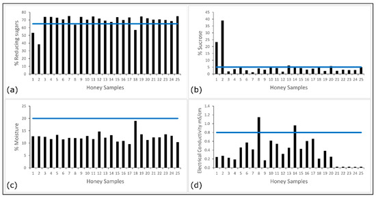 Results of basic characterization of honey samples: (a) Content of reducing sugars (%), (b) Content of sucrose (%), (c) Moisture content (%) and (d) Electrical conductivity (mS/cm). The solid lines in the graphs indicate the limit for each parameter that allows evaluating the authenticity of honey.