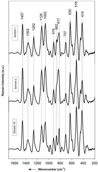 Raman spectra of honey samples from Pichincha and Loja provinces show bands at 326, 338, 419, 516, 630, 707, 817, 862, 918, 1062 and 1126 cm−1, which can be attributed to the sugars expected to occur in honey (glucose, fructose and sucrose). Figure 2 shows the Raman spectra of two allegedly adulterated samples (1 and 2) and a honey sample (19) considered “pure” because complies with the National Standard requirements. The Raman spectrum of Sample 19 shows well-defined bands at 817 and 862 cm−1 which are assigned to the fructose C-C stretching modes. For Samples 1 and 2, these bands seem to be overlapped with the strong absorptions at 822 and 834 cm−1 attributable to sucrose. It is important to remark that bands at 822 and 834 cm−1 were observed only in the spectra of Samples 1 and 2. The strong band at 630 cm−1 may be assigned to a ring deformation of the fructose [51] and the band at 516 cm−1 could be related to δ(C-2-C-1-O-1) β bending mode of glucose [54]. The bands at 415 and 437 cm−1 (glucose) and at 419 cm−1 (fructose) are overlapped, as was also reported earlier by Özbalci et al. [52]. In addition, Goodacre et al. [55] reported similar bands to those observed in this work at 1126, 1262, 1364 and 1457 cm−1 which are assigned to C-OH deformation of the glucose and sucrose, C-O-C cyclic alkyl ethers of the fructose, CH and OH bending modes of the glucose and sucrose and CH2 bending mode of the fructose, respectively.