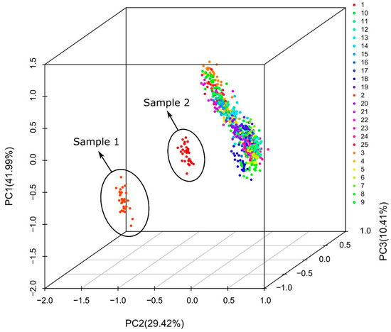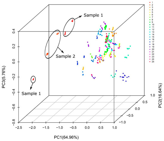 The application of the PCA to the infrared spectra of the 25 honey samples are shown in the graph of Figure 4. Different clusters for each sample can be observed, however, Samples 1 and 2 are clearly separated from all the other samples. This is in good agreement with the PCA results obtained for the Raman spectra and confirms the applicability of vibrational spectroscopy for the detection of potential adulterated honey samples.