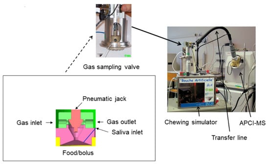 The upper part of the chewing simulator (Figure 1) was made of the upper jaw and conical palate containing the saliva inlet injector located approximately 10 mm from the upper teeth crown and central gas valve. The sampling valve was in close position when the distance between the tongue and palate was lower than 10 mm to avoid the valve and tubing from becoming contaminated and clogged. A bypass allowed the gas to flow towards the analyzer to maintain the baseline when the sampling valve was off. When the valve was open, volatiles in the headspace of the chewing simulator passed through the valve and were transferred to the mass spectrometer via the Venturi effect regulating the gas flow rate. On the opposite side of the valve, a vent allowed external air to enter the cell. All the surfaces of the chewing simulator in contact with the food were made of polyetheretherketone (PEEK). The transfer line was a deactivated fused silica capillary tube [24,28].