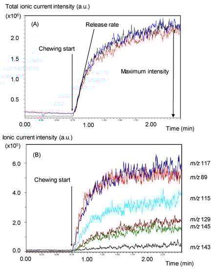 The good superposition of the total ionic current obtained for three replicates made under the same conditions shows the good reproducibility of the in vitro aroma compound release measurements made by direct coupling between the chewing simulator and APCI-MS. For example, three replicates obtained with LPM1 are shown in Figure 2. The reproducibility was generally better than what can be observed in in vivo studies that are sensitive to inter- and intra-individual variability and reproducibility [36,37]. The pattern of the temporal curve obtained while using the device was different from the typical symmetrical curve, with a pre-swallowing and a post-swallowing phase that could usually be observed for in vivo temporal compound release kinetics [38]. On the in vitro curves, the absence of the post-swallowing phase was due to the absence of a swallowing function of the chewing simulator. Thus, only the release rate (RR) and maximum concentration of released compounds (Cmax) could be extracted from the pre-swallowing phase of the curve.