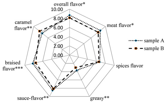 3.1. Sensory Evaluation of the Braised Pork Samples