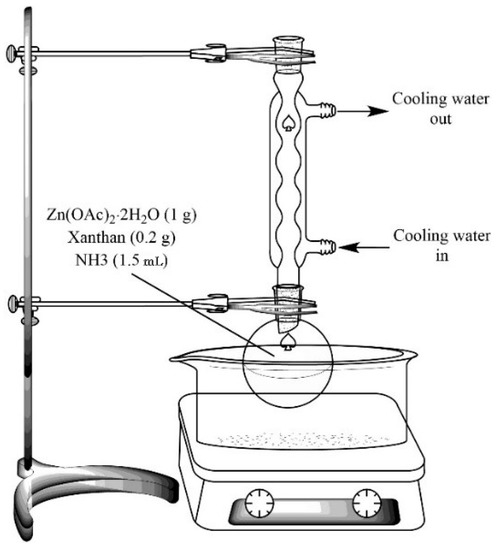 The concentrations of Zn2+, XG, and NH4OH, along with the reaction time and temperature, were chosen based on preliminary studies as they affected the size and shape of the resulting particles. In the first step, Zn(OAc)2·2H2O (as Zn2+ source, 1 g) and XG (0.2 g) were dissolved in 140 mL ultrapure water at room temperature. Then 1.5 mL ammonium hydroxide (NH4OH, 25%) was added dropwise to the solution. As schematically shown in Figure 1, the mixture was refluxed for 6 h at 80 °C, and cooled to stop the reaction. After that, the product was centrifuged and washed with deionized water. Then, 90 mL of ultrapure water was added and the mixture was refluxed for 9 h. The resulting material was washed with deionized water and dried in an oven at 60 °C for 24 h.
