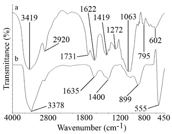 Fourier transform infrared spectroscopy (FTIR) spectra of (a) XG and (b) XG-capped ZnO microstars.