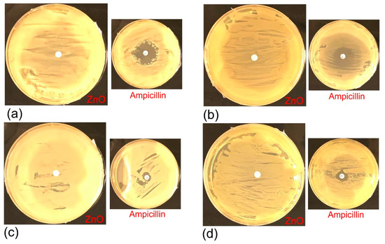 Nanometer-sized particles of zinc oxide (ZnO) have many applications in various areas due to their unique and superior chemical and physical properties compared to bulk ZnO. Over the last decade, massive investigations have also been performed to evaluate the effect of ZnO nanoparticles on the growth of microbial communities. For example, Ramesh et al. [10] investigated the antibacterial activity of green-synthesized ZnO nanoparticles with an average diameter of 29.79 nm. The zone inhibition method was used to explore the antibacterial activity of ZnO nanoparticles against Gram-positive (Staphyloccus aureus) strains, and Gram-negative (Salmonella paratyphi, Vibrio cholerae, Escherichia coli) strains. Authors have concluded that the ZnO nanoparticles exhibit good antibacterial activities by decreasing the cell growth. Banoee et al. [11] conducted a similar study which explored the antibacterial activity of ZnO nanoparticles with an average size of 20–45 nm against S. aureus and E. coli. It was observed that the presence of fabricated ZnO nanoparticles enhanced the antibacterial activity of ciprofloxacin, and increased the inhibition zone by 27% and 22%, for S. aureus and E. coli, respectively. However, the availability of 500 µg/disk ZnO nanoparticles decreased the antibacterial activity of amoxicillin, penicillin G, and nitrofurantoin in S. aureus. The antibacterial behavior of Vitex negundo extract assisted ZnO nanoparticles against S. aureus (ATCC 11632) and E. coli (ATCC 10536), and was studied by Ambika et al. [12] using the agar well diffusion method. The results showed that synthesized ZnO nanoparticles have high antibacterial activity. It was shown that the availability of ZnO nanoparticles contributed to a zone of inhibition of 19 mm and 16 mm for S. aureus and E. coli, respectively.
