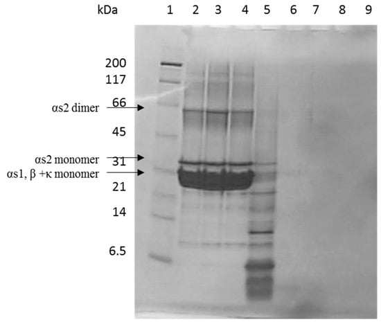 Tris-Tricine SDS-PAGE of casein hydrolysates. Casein was hydrolyzed at 37 °C for 1 h with pepsin followed by the addition of corolase. Lane 1: Molecular mass marker; lanes 2–4: Control casein incubated at 37 °C at pH 2.5 for 1 h followed by pH adjusted to 7.4 and subsequently incubated for 0, 60, or 120 min, respectively; lanes 5–9: casein incubated at 37 °C at pH 2.5 with pepsin for 1 h, followed by addition of corolase at pH 7.4 and incubated for t = 0, 10, 30, 60, 120 min, respectively. The gel was stained with Coomassie Brilliant Blue G-250. The positions of αs1 dimer, αs2 monomer, and αs1, β + κ monomers are shown on the gel.