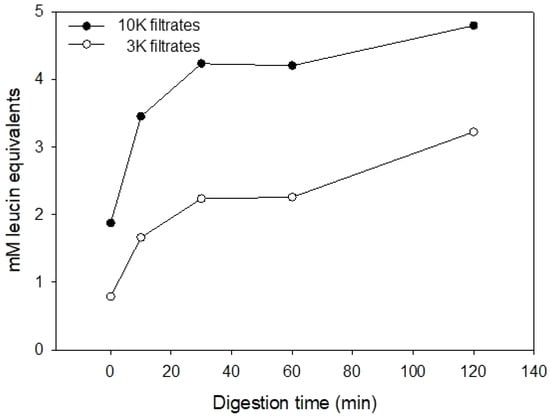 To further investigate the proteolysis of caseins by pepsin and pancreatic enzymes, the formation of free amino groups was determined at the different digestion timepoints (Figure 2). This was conducted after the hydrolysates had been filtrated by 10 kDa and 3 kDa filters. Both 10 K and 3 K casein hydrolysate revealed an increase in free amino groups, and thereby the formation of new peptides or free amino acids, or both. The concentration of free amino groups was higher in the 10 K filtrates than in the 3 K filtrates.