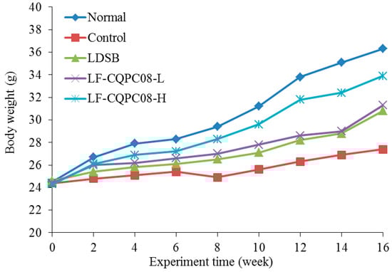 Body weight of mice during the experiment. LDSB: mice treated with 4NQO and Lactobacillus delbruechii subsp. bulgaricus (1.0 × 109 CFU/kg); LF-CQPC08-L: mice treated with 4NQO and Lactobacillus fermentum CQPC08 (1.0 × 108 CFU/kg); LF-CQPC08-H: mice treated with 4NQO and Lactobacillus fermentum CQPC08 (1.0 × 109 CFU/kg).
