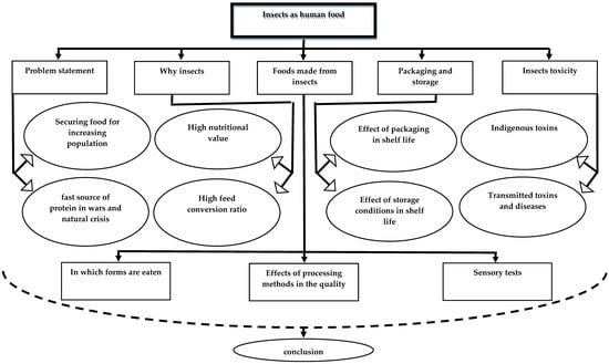 The global population is steadily increasing [1,2], making food security a crucial issue world-wide. Both the quantity and quality of food supply are of interest in the context of food security. All major nutrients are important, but protein is one of the main nutrients required by humans, and protein deficiency leads to severe illness. Protein from animal sources may be especially valuable, as it contains essential amino acids that are not found in many plant proteins. However, protein from animal sources is not always affordable for a large share of the global population [3]. Moreover, devastating wars are still occurring in various parts of the world, resulting in millions of people, especially innocent civilians, being displaced and often suffering from malnutrition due to a lack of food. During or immediately after wars, people need a fast source of protein, but conventional sources of protein (animals and plants) take a long time to become available. This means there is a need for fast protein sources that are nutritionally similar to protein from conventional sources. During the First World War, Germany used single-cell protein as the source of protein in animal feed, in order to meet human protein requirements [4]. However, direct consumption and excess consumption of single-cell protein by humans have negative effects on health, since it contains nucleic acids which cause the precipitation of uric acid in the human body, leading to gout and the formation of kidney stones. Another issue with the production of protein from animal sources is that it requires advanced resources, in many cases making it unsustainable for the environment [5]. Moreover, animal rearing for food is controlled by strict ethical rules and regulations, which can complicate the process. For the above reasons, an alternative source of protein is needed to assist in assuring food security for the increasing global population. One such source could be insects. The aim of this literature review was to examine the use of insects as a sensory appealing food and to identify knowledge gaps in this area (Figure 1). Although it is commonly claimed that insects are a non-traditional food, more than two billion people in 113 countries generally eat insects directly or use them as food ingredients [6,7,8]. It is estimated that there are up to 1900–2000 species of edible insect [6,9]. The tradition of eating insects is very old, e.g., there is evidence that insects were eaten during pre-historic times, forming an important source of protein [10,11].