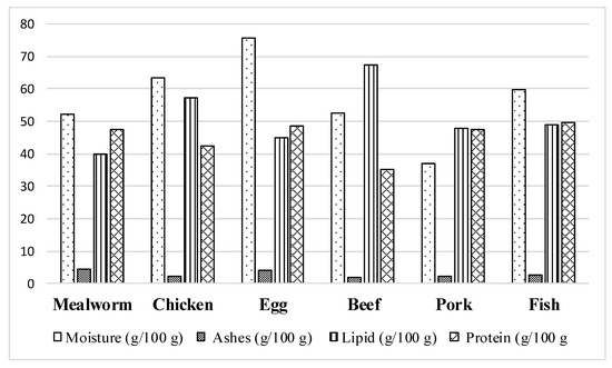 Regarding the nutrient content, insects such as mealworms, but also other species, have the potential to complement and/or replace conventional foods, as they exhibit favorable nutrient profiles [20]. For example, the protein content of the grasshopper (Schistocercagregaria) is reported to comprise 76% of DW and that of tropical house crickets (Gryllodessigillatus) around 70% of DW, which is similar to the protein content of whey (~87% of DW) and chicken eggs (~82.1% of DW) [22]. In terms of the essential amino acids methionine and cysteine, house crickets contain the daily intake recommended by World Health Organization (WHO) [20]. Iron and zinc are very important micronutrients for human nutrition and insects are rich in minerals. For example, grasshoppers contain about 8 mg/100 g iron, which is higher than the iron content in beef (~6 mg/100 g). Fat content has a direct impact on the total energy of food. Whole milk powder contains about 26% fat [23]. Mealworms, which contain around 25% fat [24], can thus be considered a rich source of fat, and therefore of energy (Figure 2).