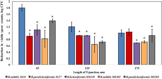 Effect of the cleaning procedure with tap water on the removal of biofilm-derived spores of the dairy-associated Bacillus in the CIP model system. Sampling plates, each containing approximately 2 million spores of B. subtilis 3610 or dairy Bacillus isolates, were mounted on T-junctions, protruding 35, 125, and 275 mm from the main loop of the CIP model system, and cleaned in the installation. Tap water, without the addition of any detergent, was used as the cleaning agent. A basic assumption was the similar adhesion efficiency of the spores of each tested strain in different experimental repeats (since the spores were obtained using previously validated experimental procedures [21]). The cleaning effect was evaluated by comparing the number of viable spores (attached to the sampling plates), before and after cleaning. The results represent the means and standard deviations (SD) of two independent biological experiments, performed in triplicate. * Statistically significant difference (p < 0.05) between the reduction in the viable spore counts of a given sample and the reduction in the spore counts for B. subtilis 3610 (control).
