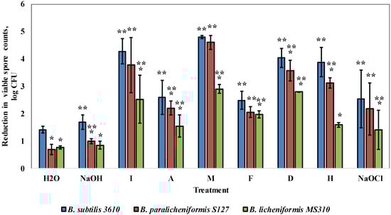 Effect of the examined cleaning agents on the viability of the biofilm-derived spores of the tested Bacillus strains. Caustic soda, sodium hypochlorite, and different cleaning solutions—I, A, M, F, D, and H (compositions are described in Methods)—were added to the tubes, with spore suspension of the tested Bacillus isolates. Spore suspension, without any detergent, was used as the control. The effect on spore viability was evaluated by comparing the numbers of viable spores in the control and after the treatment with the tested agents (following 10 min of incubation at 50 °C, 250 rpm). The results represent the means and standard deviation (SD) of two independent biological experiments, performed in duplicate. * Statistically significant difference (p < 0.05) between the viable spore counts in a given sample versus the spore counts after cleaning with water (control).