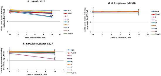 Primarily, we determined the ability of the tested agents to remove surface-attached spores, without affecting the viability (cleaning effect) and/or inactivating the spores (disinfecting effect). For this, spore suspensions were incubated with each of the tested agents under the conditions of the laboratory system. We found that the examined agents had different influences on the viability of the biofilm-derived spores of the tested strains (Figure 4). Thus, solutions D and M notably reduced the spore counts of B. subtilis 3610, after 10 min of incubation (Figure 4); there was a 0.5 log reduction in the viable spores for S127, after incubation with solution I; while none of the tested solutions affected the viability of the MS310 spores. Interestingly, NaOCl, commonly used as a disinfecting agent, did not influence the viability of the tested strains at the examined concentration (the dosage widely used in industrial cleaning agents; Figure 4).