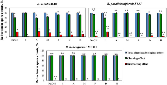 Next, we determined a correlation between the cleaning and disinfecting effects of the tested detergents. Thus, we defined the ability of a cleaning agent to reduce the number of viable spores after 10 min of a cleaning cycle, as a disinfecting effect. We compared the percentage of the disinfecting effect to the total chemo-biological effect of a cleaning agent (taken as 100%). The difference between the total chemo-biological effect of the tested agent and the disinfecting effect was defined as the cleaning effect [21]. As can be inferred from Figure 5, the ratio between the cleaning and disinfecting effects of the examined detergents differed for the tested strains. Thus, the removal of the MS310 spores was due solely to the cleaning effect of the tested solutions. B. paralicheniformis S127 was significantly more resistant to the disinfecting effect of agents A, M, F, H, and NaOH, compared to B. subtilis 3610, but much more susceptible to the disinfecting effect of solution I (Figure 5). Overall, the chemo-biological effect of the tested agents was mostly due to the removal of surface-attached spores (cleaning effect) and not to disinfecting.