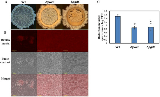 Biofilm colonies were generated at 30 °C in a biofilm-promoting medium (LBGM = LB + 1% v/v glycerol + 0.1 mM MnSO4) [26]. Biofilm-derived spores were obtained from colonies, as described previously [21]. Briefly, the grown (three-day-old) colonies, harvested and suspended in phosphate buffered saline (PBS; 0.01 M phosphate buffer, 0.0027 M KCl, 0.137 M NaCl per 200 mL, Sigma Aldrich, St. Louis, MO, USA), were disrupted by mild sonication (Vibra Cell, Sonics, Newtown, CT, USA; amplitude 60%, pulse 10 s, pause 10 s, duration 2 min, instrument power: 7.2 Joules per second). During sonication, the samples were kept on ice. Then, heat killing was performed at 80 °C for 20 min. Cell numbers after heat killing were quantified by the spread plating method.