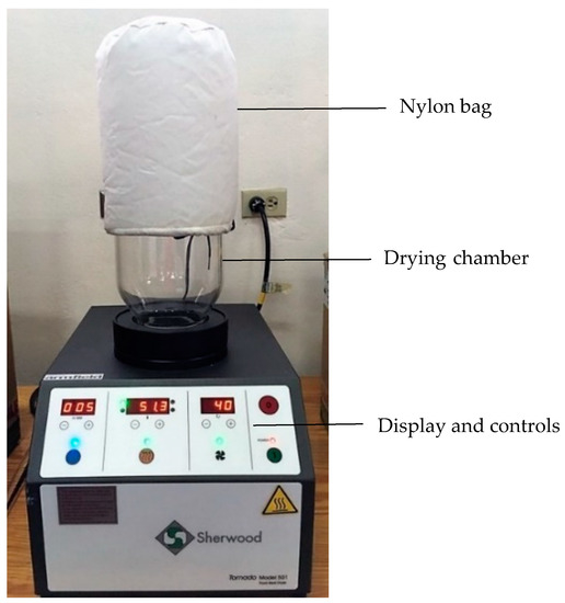 Fluidized bed drying of the pumpkin seeds was performed using a Sherwood Fluid Bed Dryer (Sherwood Scientific Ltd., Cambridge, UK) shown in Figure 1. The dryer consisted of a base unit with a timer, temperature (20–199.9 °C) and velocity (0–127) display and control, a 2 L glass tub with inlet filter and a nylon bag. Velocity/blower settings corresponded to a range in air velocity from 0.35 to 6.70 m/s and ambient air drawn through the inlet air filter by a centrifugal blower was heated by a 2 kW electrical heater.