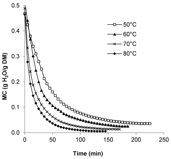 Drying curves for seeds dried at 50 to 80 °C at an air velocity of 2.87 m/s are illustrated in Figure 2. The higher the temperature, the greater the decline in moisture values, especially noticeable during the first 50 min of drying. The increase in decline in moisture content versus time with increasing temperature is a common observation of many food dehydration studies and was also shown for salted, hull-less pumpkin seeds dried in a tray dryer at 40–60 °C [13]. To achieve a minimum of approximately 4–6% (wb) moisture which appears to be the most commonly reported moisture value for dried seeds, seeds can be dried for 135, 110, 60, and 40 min at 50, 60, 70, and 80 °C, respectively.