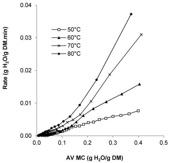 The drying rates of pumpkin seeds dried at 50–80 °C are illustrated in Figure 3. Construction of drying rate curves is a common feature of drying studies, as they assist in dryer selection and optimizing of drying conditions [30].
