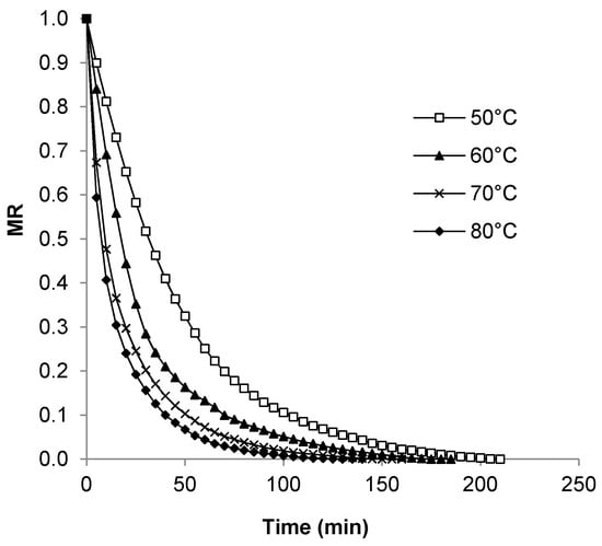 Moisture Ratio (MR) curves presented in Figure 4 follow the same trend as the drying curves, highlighting the effect of drying temperature. The higher the temperature, the greater the decline, especially during the first 50 min of drying. The most pronounced temperature effect was seen as the drying temperature increased from 50 to 60 °C. A similar decline in MR was seen for salted pumpkin seeds dried at 60–80 °C in a fluidized bed dryer [15].