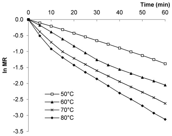 Plots of ln MR versus time (Figure 5) revealed one straight-line segment for seeds dried at 50 °C, but two distinct portions for seeds dried at 60 °C (30 min), 70 °C (15 min), and 80 °C (10 min), representing the transition from first to second falling-rate period. This transition occurred at an average moisture value of 0.18 g H2O/g DM. Increasing the drying temperature resulted in a decrease in the time taken to transition from the first falling-rate to the second falling-rate period.
