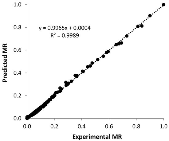 Experimental data for each drying treatment was fitted to twenty-two thin layer models. Table 4 gives the thin layer models that best fit the data for each drying treatment based on the highest R2 value and lowest value of RMSE and χ2, the approach also used for the tray and fluidized bed drying of pumpkin and squash seeds [13,18]. While model fit varied with drying temperature, the Alibas model could be successfully used (R2 = 0.9989) as a general model to predict the MR data for all temperatures investigated (Figure 6).