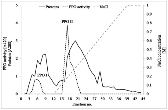 One-hundred grams of sprouts were homogenized in 250 mL of 50 mM TRIS-HCl buffer (pH 6.5) containing 10 mM of ascorbic acid and 0.5% polyvinylpyrrolidone and were extracted with the aid of a magnetic stirrer for 1 h at 4 °C. The crude extract samples were centrifuged at 9000× g for 20 min at 4 °C. Solid (NH4)2SO4 was added to the supernatant to obtain 80% saturation. After that, the precipitated proteins were separated by centrifugation at 9000× g for 30 min at 4 °C. The precipitate was dissolved in 60 mL of 5-mM TRIS-HCl (pH 7.0) and was dialyzed for 48 h using the same buffer in a cellulose bag with a membrane MWCO bigger than 12,000 Da at 4 °C. Afterwards, the dialysate was transferred to a DEAE–Sepharose column (20 × 250 mm) equilibrated with 5 mM of TRIS-HCl buffer, pH 6.5. Proteins were eluted, employing a linear gradient of 0 to 1.0 M of NaCl in 5 mM of TRIS-HCl buffer (pH 6.5) at a 30-mL·h−1 flow rate. Three-milliliter fractions were collected, for which protein content (280 nm) and PPO activity toward catechol as a substrate were monitored. Fractions that showed PPO activity were collected.
