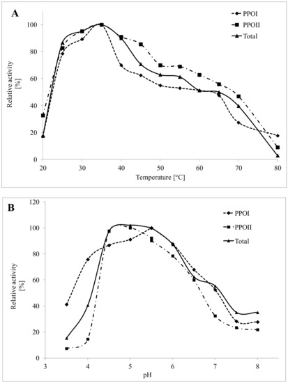 Figure 2A shows the influence of temperature on PPO activities in the assay conditions (pH 5.5 and 50 mM catechol as a substrate). PPO I, PPO II, and total PPOs reached maximum activity at 35 °C. The optimal temperatures for PPO activity are substrate-dependent and may differ for PPOs obtained from various sources [24]. It has been reported that when catechol is used as a substrate, the optimum temperature is 40 °C for PPOs from Chinese cabbage [25], soybean sprouts [26], and parsley [24]; and 25–30 °C for bananas [27]. Higher optimal temperatures were reported by Serradell et al. [28] and Navarro et al. [15] for PPOs isolated from strawberries (50 °C) and persimmons (55 °C).