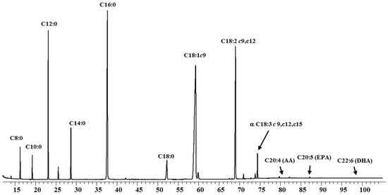 Table 1 shows the FA composition (g FA/100 g of total FA) of the IF products at reception and at the end of their shelf lives (since no significant changes occurred, the mid storage values are not shown). Few studies related to the composition of FA in IF during storage are available in the literature. All the samples, except IF4, the mean values for saturated fatty acids (SFA) 39.68–62.40% were slightly higher than those found in human milk (30–50%) [22]. All the IF except IF4 had palmitic acid (C16:0) 16.58–22.78% as the main FA. For IF4 the most important fatty acids were caprilic (C8:0) 31.90% and capric (C10:0) 20.67%. In IF2 (Figure 1) and IF3 were found contents of lauric acid (C12:0) above 10% and for IF1 and IF5, stearic acid (C18:0) had levels of 6.96% and 7.72% respectively. Sample IF4 showed high concentration of the medium chain fatty acids (C8:0, C10:0). As this IF is designed for premature babies, that compounds are suitable for their digestibility, as energy source [23]. In all samples, oleic acid (C18:1) showed 22.85–38.76% in agreement with the recommended contents 24–40% to these milks [24,25]. The composition of IF5 samples had a total content in PUFA of 30.47% due to its concentrations in linoleic acid (LA) 26.65%. The recommend ω6/ω3 ratio given for several guidelines is 5–10:1 [22] being, in the assayed samples, from 12 to 6. In general, DHA was not detected except for IF4, in concentrations lower than the normal content in human milk 0.3%.