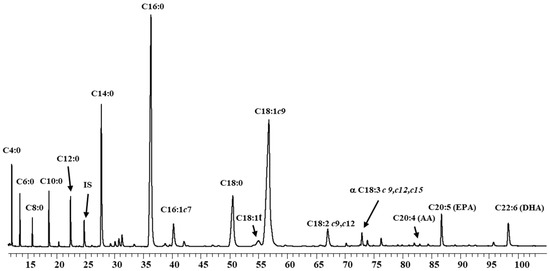 Fatty acid profile of PUFA UHT-enriched milk (Mw2) by gas chromatographic. c: cis; t: trans; AA: arachidonic acid; EPA: eicosapentanoic fatty acid; DHA: docosahexanoic fatty acid; IS: Internal Standard.