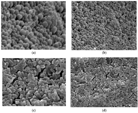 Scanning electron micrograph (SEM) of freeze dried (a) L. plantarum, (b) L. paraplantarum, (c) W. paramesenteroides, and (d) E. faecalis.