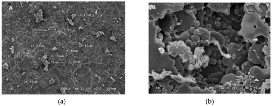 Encapsulated arrowroot and maltodextrin bacteria generated hydrophobically showed a regular and identical aspect, while freeze-dried bacteria showed a certain space from one bacteria to another. These findings could be related to the cooling of the hydrophobic material that occurs due to their low heat transfer to dry the beads. Freeze-dried beads had both a round and bacilli shape, soft surface and concavities; however, the capsules showed only a round shape inside the different materials of arrowroot and maltodextrin that indicated the fundamental origin of the concavities was a drying feature of the membrane. These structures may be established by the fast drying process, which led to crustiness and reduced diffusion of the water on top of the beads; in addition, there was a high-pressure established surface [42,43].