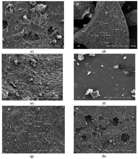 Scanning electron micrograph (SEM) of the encapsulated beads. (a) W. paramesenteroides-encapsulated arrowroot, (b) W. paramesenteroides-encapsulated maltodextrin, (c) L. paraplantarum-encapsulated maltodextrin, (d) L. paraplantarum-encapsulated arrowroot, (e) E faecalis-encapsulated arrowroot, (f) E faecalis-encapsulated maltodextrin, (g) L. plantarum-encapsulated arrowroot, and (h) L. plantarum-encapsulated maltodextrin.