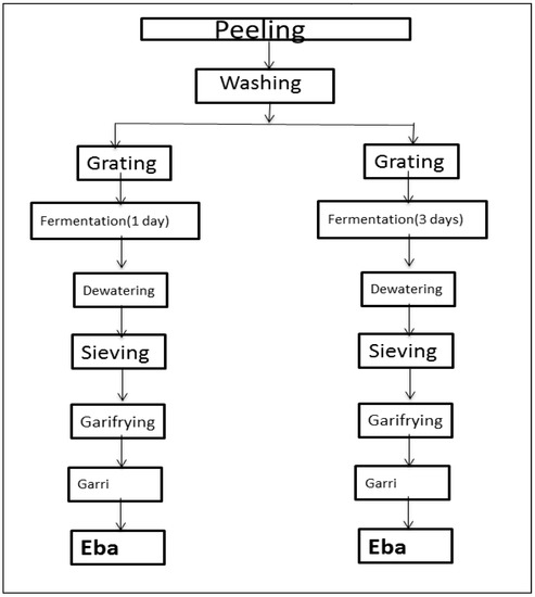 - James, B.; Okechukwu, R.U.; Abass, A.; Fannah, S.; Maziya-Dixon, B.; Sanni, L.O.; Osei-Sarfoh, A.; Fomba, S.; Lukombo, S. Producing Gari from Cassava: An Illustrated Guide for Smallholder Cassava Processors; International Institute of Tropical Agriculture (IITA): Ibadan, Nigeria, 2012. [Google Scholar]