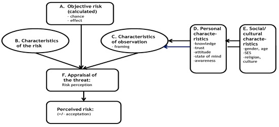 This model describes the objective risk (A, chance and effect) and a description of the risk (B, characteristics of the risk). Consumers have a risk perception, which is not only based on objective information, but also on personal (D) and social/cultural (E) characteristics. This is called characteristics of observation (C, framing). All these factors together determine how consumers perceive a risk (F, E-numbers) and whether they will accept it or not (+/−).