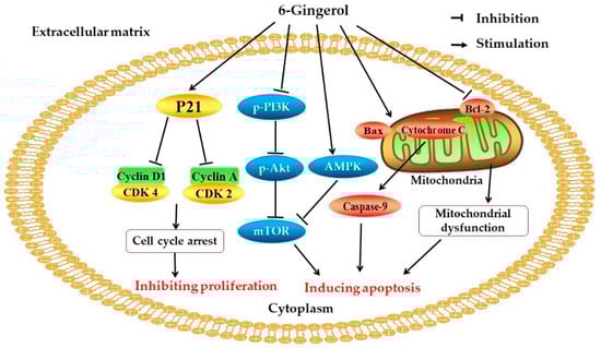 | 6-gingerol | In vitro | HeLa human cervical adenocarcinoma cells | 60, 100, and 140 μM | Inducing cell cycle arrest in the G0/G1-phase; decreasing the levels of cyclin A, cyclin D1, and cyclin E1; increasing the expression of caspase; inhibiting the mTOR signaling pathway | [65] |