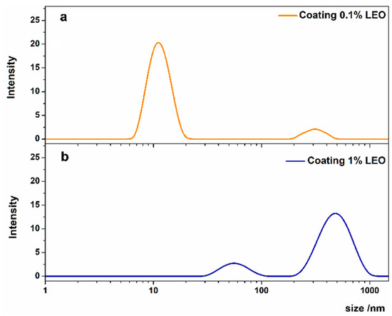 With the aim of further expanding the exploration of the applicability of LEO/alginate-based nanodispersions in routine coating experiments, we considered two type of nanodispersion that differ with respect to LEO content [12]. The two nanoformulations were characterized through DLS and rheology before coating application. From the DLS investigation (Figure 1) it was found that 0.1% LEO nanodispersions had a dispersed phase size of about 12 nm with a 0.5 value of polydispersity index (PDI). A lower homogeneity, instead, was found for the 1% LEO nanodispersion presenting two populations of aggregates around 60 and 600 nm respectively, and a higher PDI value of about 0.8.