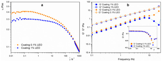 The rheological characterization of the nanodispersions was determined with rotational and oscillatory tests. In Figure 2a, flow curves of both the nanoformulations showed that apparent viscosity decreased along with the shear rate, indicating a shear-thinning behavior, generally attributable to the alignment of the polymer molecules with the flow [23]. The difference in apparent viscosity that was higher at lower LEO content can be explained with a dilution effect of alginate in the continuous phase promoted by the increase of the oil concentration [24].