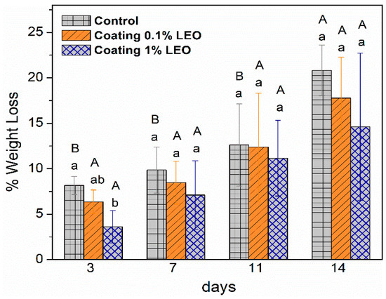 Weight loss percentage of coated and uncoated (control) fresh-cut apples with different treatment during storage at 4 °C. Means with the same letters (lowercase: amongst different treatments for the same time; uppercase: for the same treatment during different storage times) are not significantly different according to Tukey’s test (p > 0.05). Vertical bars indicate standard deviation.