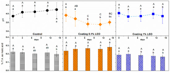pH (upper panels) and titratable acidity (lower panels) of fresh-cut apples with different treatment during storage at 4 °C. Means with the same letters (lowercase: amongst different treatments for the same time; uppercase: for the same treatment during different storage times) are not significantly different according to Tukey’s test (p > 0.05). Vertical bars indicate standard deviation.