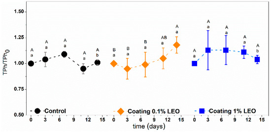 Total phenols ratio of fresh-cut apples with different treatment during storage at 4 °C. Means with the same letters (lowercase: amongst different treatments for the same time; uppercase: for the same treatment during different storage times) are not significantly different according to Tukey’s test (p > 0.05). Vertical bars indicate standard deviation.