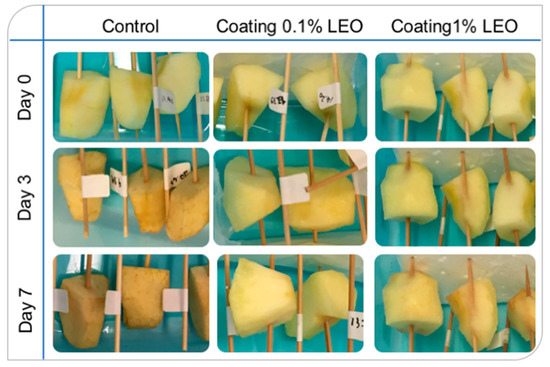 Browning occurrence is a critical aspect that makes the produce less desirable to consumers. As can be observed from Figure 6 apple pieces coated with nanoformulations containing 0.1% LEO and 1% LEO during storage were less browned. The first row of Figure 6 shows apple pieces as soon as cut and coated, when all the samples share a good appearance. The aspect of the coated pieces was still agreeable and, in particular, apple pieces covered with 1% LEO nanoformulation seemed clearer than the others, maybe because the larger oil droplets, with their light scattering contribution added a whitening effect to the fruit pieces. During the storage period, after 3 and 7 days (second and third rows of Figure 6, respectively) the apple pieces coated with the 0.1% LEO nanoformulation were the least browned.