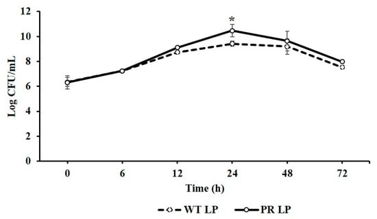The growth and survival ability of LP and LP+PR strains were compared by enumerating viable cell counts after 0, 6, 12, 24, 48, and 72 h time intervals and shown in Figure 1. LP+PR strain showed greater survival rate than the wild-type LP strain after 12 h incubation. Most importantly, the bacteriophage resistant LP+PR strain (10.46 log CFU/mL) exhibited significantly higher survival rate in comparison to wild-type LP strain (9.41 log CFU/mL) at 24 h (P < 0.05). These results demonstrate that LP and LP+PR strain was able to grow and survive under in vitro condition but LP+PR could grow and survive better than the wild-type LP strain.