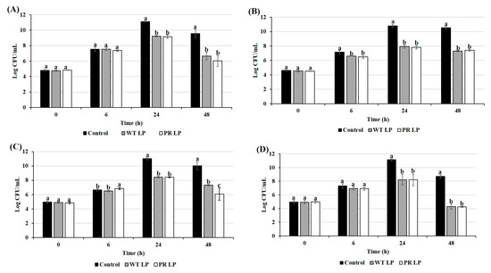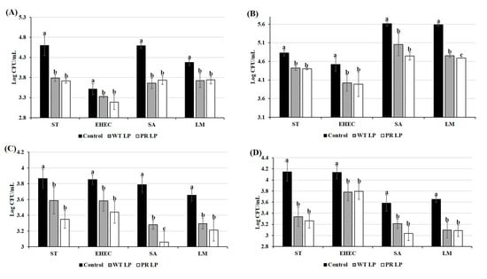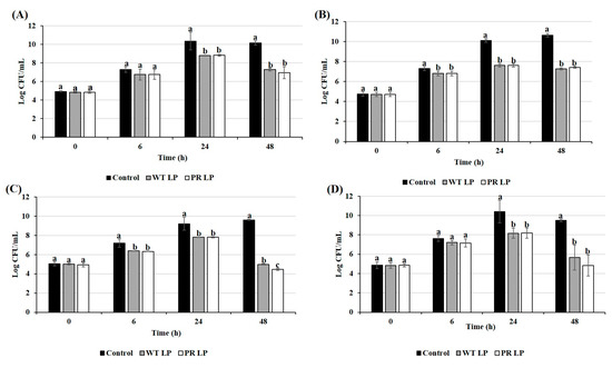 Overnight (18 h) liquid cultures of LP and LP+PR strains were grown in DMEM supplemented with 5% FBS and centrifuged at 4000× g for 20 min (Thermo fisher Scientific Inc., MA, USA). Cells were washed twice with PBS and CFCSs were further filtered by sterile syringe 0.2 µm filter (VWR Inc, PA, USA) and stored at 4 °C [24,25]. The bacterial cell suspension containing 400 µL (1 × 105 CFU/mL) of S. Typhimurium, EHEC, S. aureus, or L. monocytogenes and 400 µL CFCSs collected from LP or LP+PR strain were inoculated in a separate culture tubes with 3.2 mL of DMEM and 5% FBS. The culture tubes were incubated at 37 °C and samples were plated on specific agar plates at 0, 6, 24, and 48 h. Plates were incubated at 37 °C for 24 h and surviving bacteria were counted as CFU/mL.