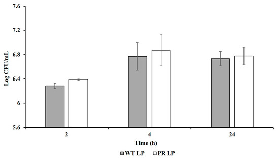 Adhesion of LP+PR strain to host cells was examined using human epithelial INT-407 cells (Figure 4). Adhesion abilities of wild-type LP strain were recorded as 6.29 log CFU/mL, 6.77 log CFU/mL, 6.73 log CFU/mL at 2, 4, and 24 h, respectively. Whereas the mutant LP+PR adhered aggressively to the INT-407 cells at 6.39 log CFU/mL, 6.87 log CFU/mL, and 6.79 log CFU/mL at 2, 4, and 24 h, respectively. We found that LP+PR strain can adhere more effectively to INT-407 cells compare to wild-type LP strain. However, there is no significant difference between wild-type LP and LP+PR strain.